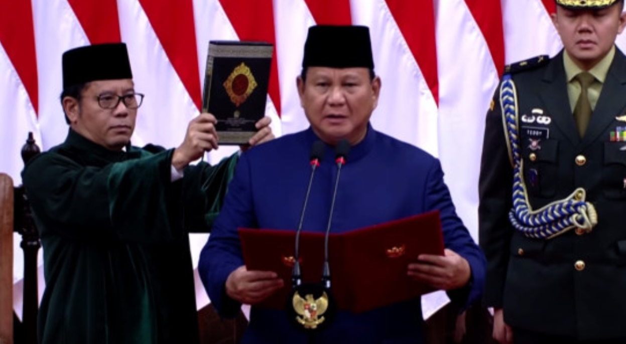 Prabowo Subianto saat mengucapkan sumpah dan janji sebagai presiden RI, Minggu (20/10). (SCIENTIA/Youtube Kesekretarian Presiden)