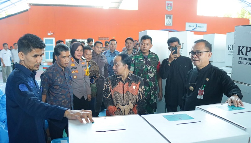 Pjs Wali Kota Bukittinggi, Hani Syopiar Rustam, didamping Ketua KPU Kota Bukittinggi, Satria Putra, menyampaikan, berdasarkan tinjauan lapangan hari ini, seluruh logistik utama dan pendukung sudah tersedia lengkap, dan saat ini dalam tahap akhir memasukkan seluruh logistik ke dalam kotak suara sesuai TPS.