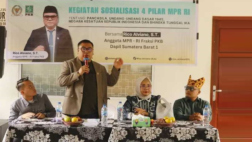 Sawahlunto, Scientia.id – Anggota MPR RI dari Fraksi Partai Kebangkitan Bangsa (PKB), Rico Alviano, melaksanakan kegiatan sosialisasi Empat Pilar kehidupan bermasyarakat yang meliputi Pancasila, UUD 1945, Negara Kesatuan Republik Indonesia (NKRI), dan Bhineka Tunggal Ika sebagai semboyan negara. Kegiatan ini bertujuan untuk meningkatkan pemahaman penghayatan masyarakat terhadap prinsip-prinsip dasar kehidupan berbangsa dan bernegara.