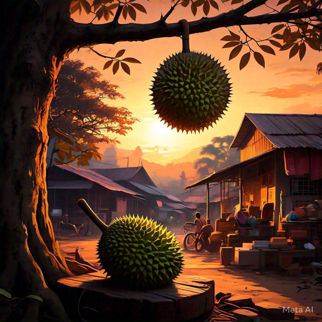 “Lihat…” Jawab Mardi sembari menunjuk sembunyi-sembunyi dari balik badan kearah buah durian itu.