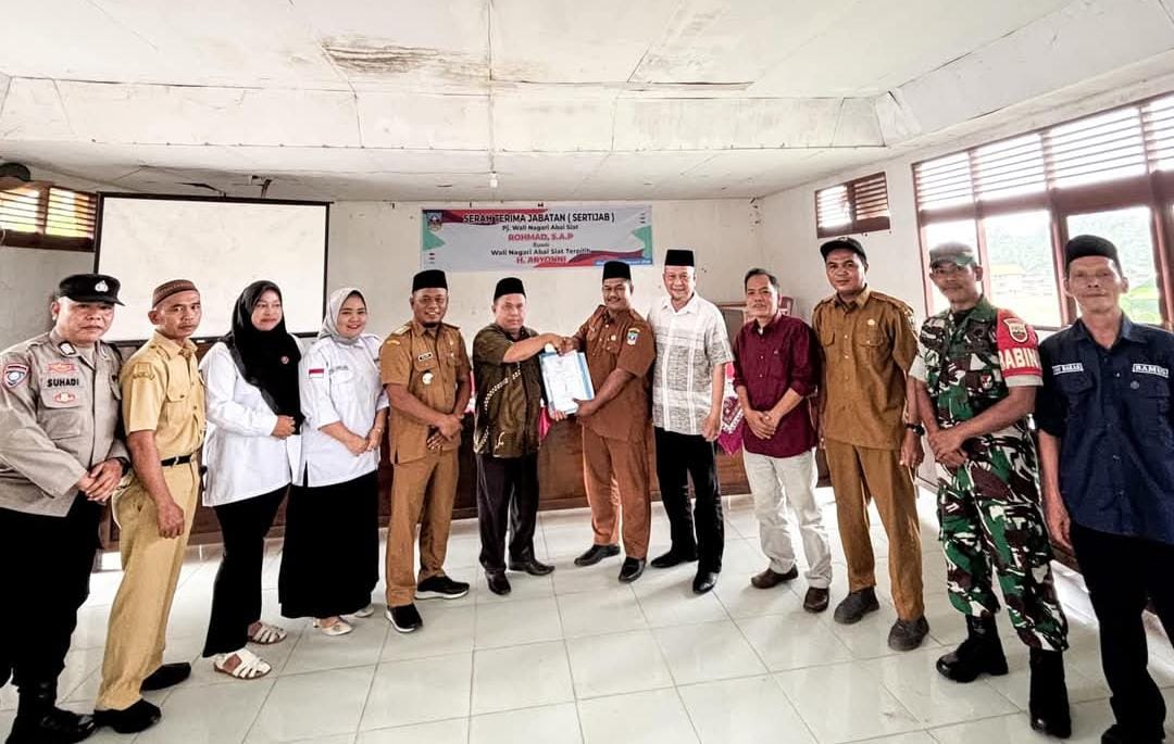 Dharmasraya, SCIENTIA – Penjabat (Pj) Wali Nagari Abai Siat, Rohmad, melaksanakan serah terima jabatan kepada Wali Nagari PAW terpilih, Aryonni, untuk masa jabatan 2021-2029, bertempat di kantor Wali Nagari setempat, Senin (3/2).
