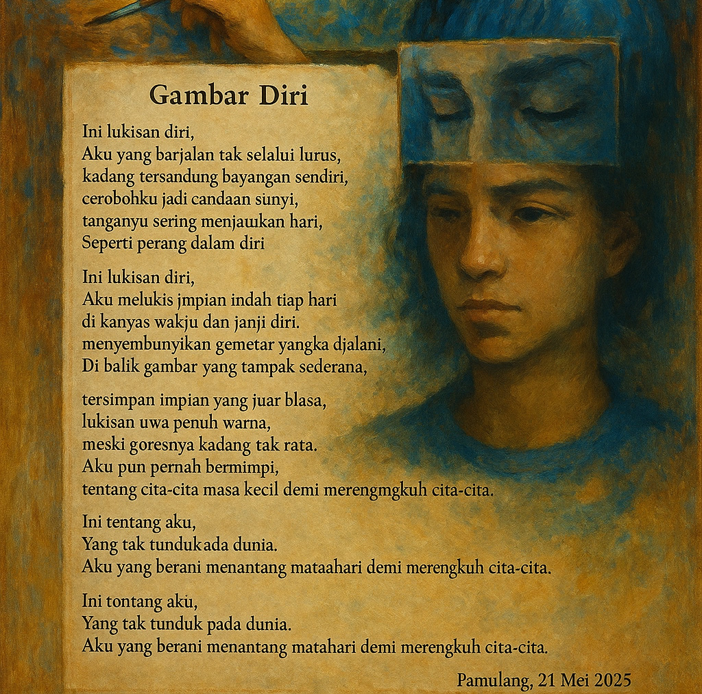 Puisi pertama, “Gambar Diri”, menggambarkan perjalanan batin dan refleksi seorang individu dalam mengenal, menerima, dan memperjuangkan jati dirinya. Aku lirik dalam puisi ini berusaha memahami dirinya, bahwa sebagai seorang manusia biasa dia mempunyai kelemahan dan kekuatan. Kelemahan membuatnya melakukan kesalahan dan cemas dengan kenyataan, seperti diungkapkan dalam larik “Aku yang berjalan tak selalu lurus” dan “tanganku sering menjatuhkan hari”. Kelemahan diri terebut menggetarkan nyalinya, “Bibirku ragu tuk berkata, takut suara tak sampai makna”.
