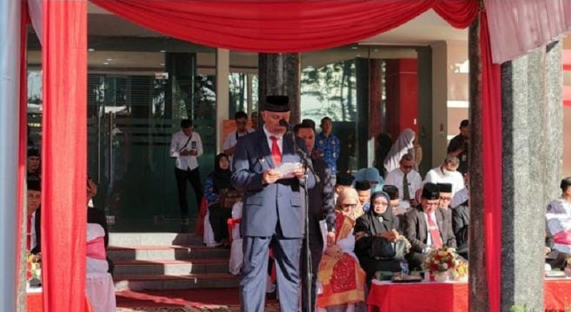 Mahyeldi membacakan pidato Kepala Badan Ideologi Pancasila (BPIP) RI, mengajak masyarakat untuk menjadikan Pancasila bukan sekedar teks, melainkan tuntunan dalam berbangsa untuk mewujudkan Indonesia yang merdeka, bersatu, berdaulat, adil dan makmur.