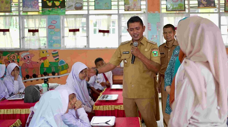 Dalam kesempatan tersebut, Bupati membagikan langsung makanan bergizi kepada para siswa. Setelah itu, ia menyempatkan diri menyapa para siswa dari kelas ke kelas, melihat langsung suasana anak-anak yang tengah menikmati santapan sehat mereka. Suasana hangat dan akrab terlihat dari interaksi Bupati dengan para siswa.