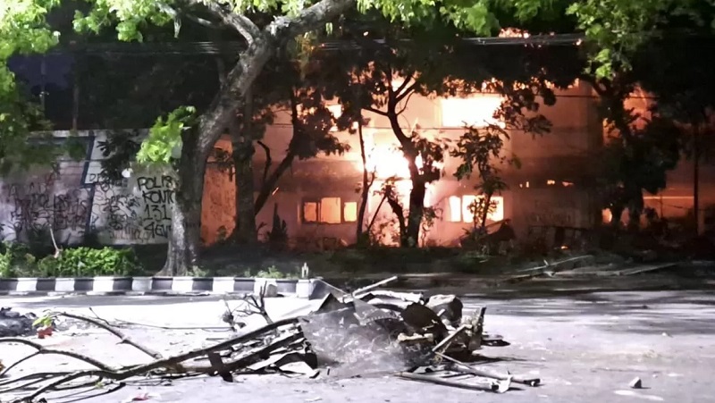 “Revolusi, revolusi,” teriak massa sambil menyaksikan bangunan terbakar. Asap hitam pekat membubung tinggi dan terlihat jelas dari kejauhan.