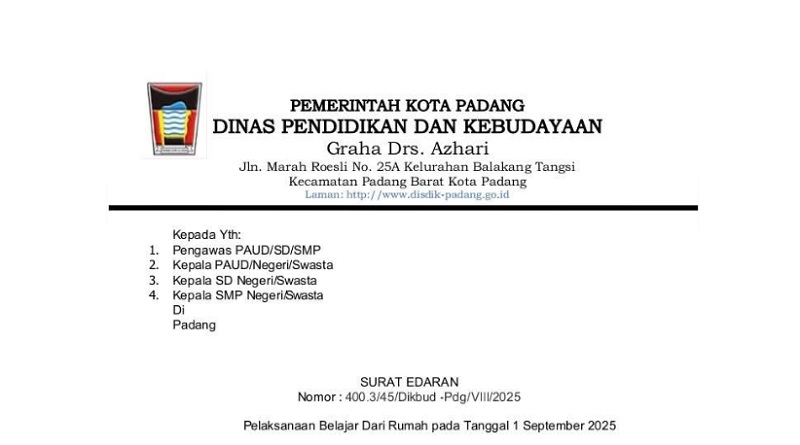 Surat edaran belajar dari rumah bernomor 400.3/45/Dikbud-Pdg/VIII/2025. Surat itu ditandatangani Kadis Pendidikan dan Kebudayaan pada tanggal 31 Agustus 2025. (*)