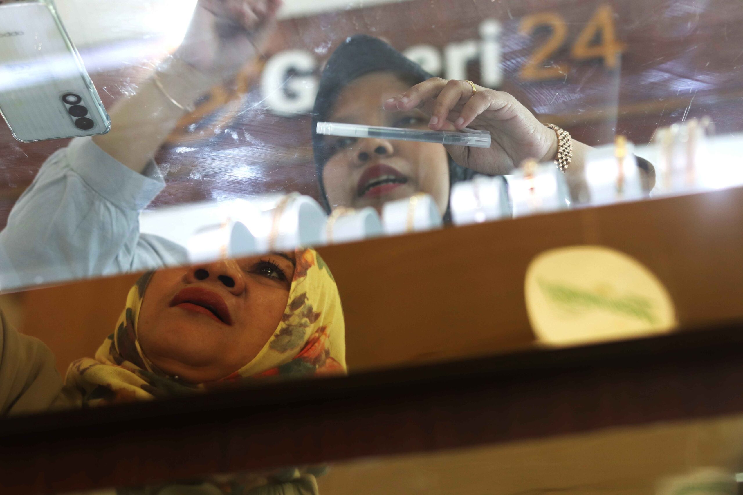 Seorang nasabah #mengEMASkanindonesia sedang mengecek saldo emas di aplikasi Tring di Kantor Pegadaian Tarandam Padang, Selasa (30/9). (SCIENTIA/Foto: Wahyu Saputra)