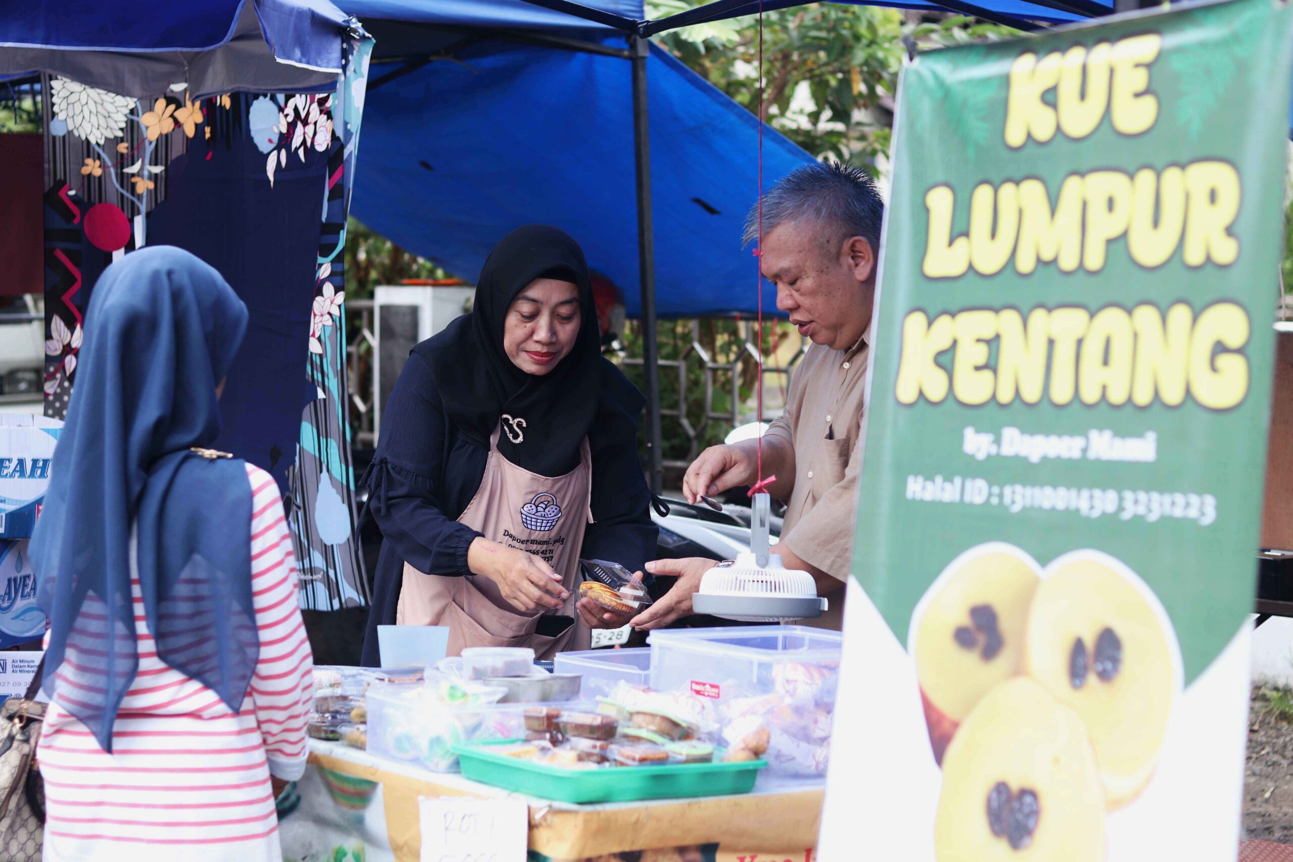 Dalam suasana riuhnya orang lalu lalang, suaminya, Junaidi (48 tahun) dengan cekatan membungkus pesanan. Lalu, Citra Wulandari (22 tahun) anaknya, juga tanpa beban memasak adonan Kue Lumpur Kentang sebagai menu andalan. Mereka berbagi peran, agar jualan hari itu cepat ludes dan bisa pergi arisan yang telah dijanjikan.