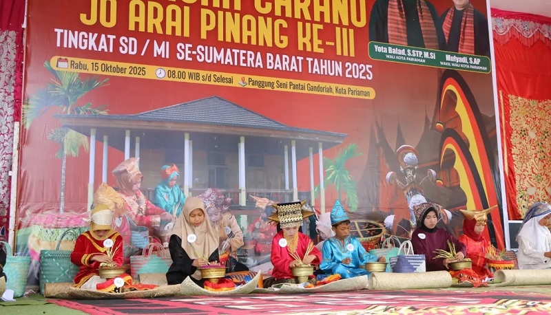 Pariaman, Scientia.id – Suasana penuh semangat mewarnai Festival Malingka Carano Jo Arai Pinang tingkat SD/MI se-Sumatera Barat Tahun 2025 yang digelar di Panggung Utama Pantai Gandoriah, Rabu (15/10). Ajang ini diselenggarakan oleh Musyawarah Kerja Kepala Sekolah (MK3S) Kecamatan Pariaman Timur dan dibuka resmi oleh Wali Kota Pariaman Yota Balad.