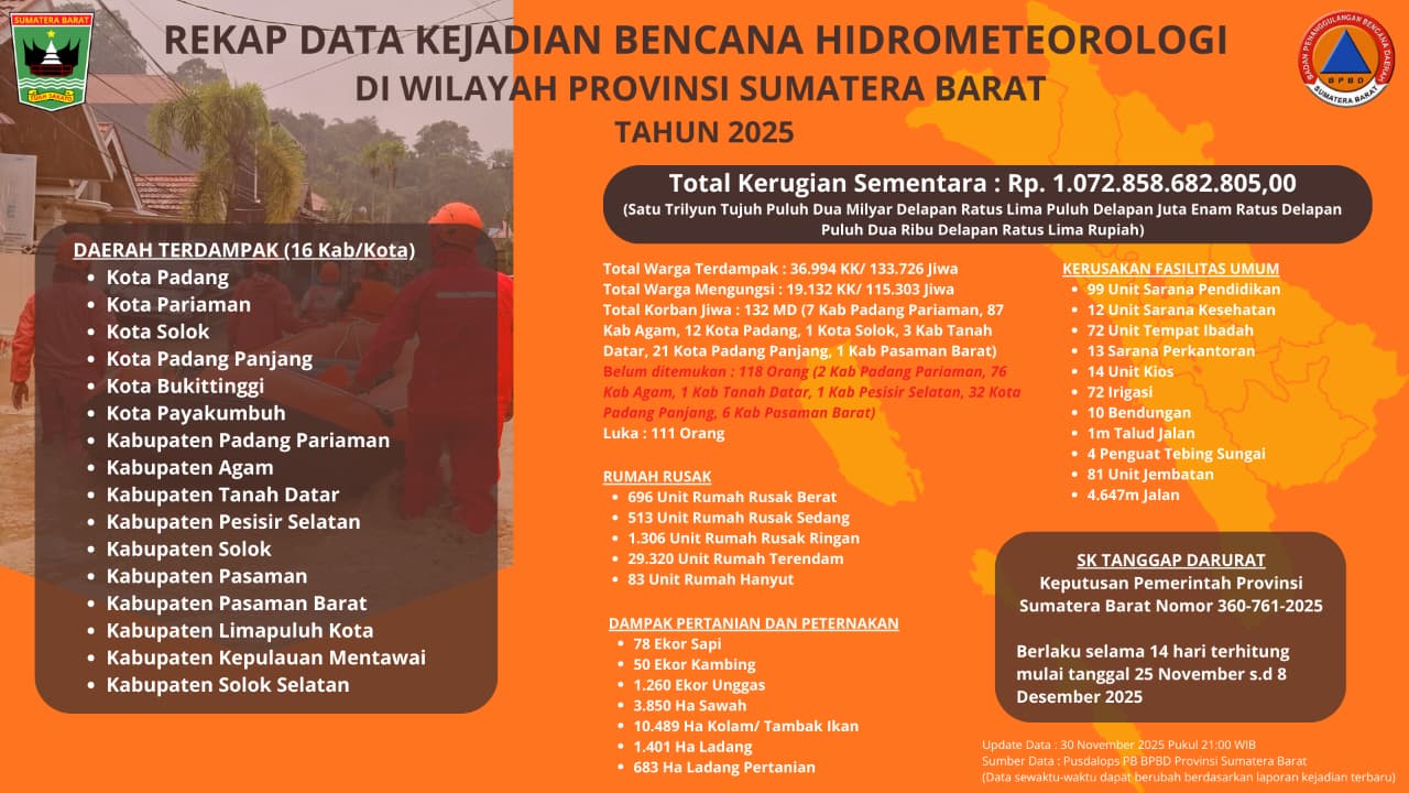 Padang, Scientia – Jumlah korban jiwa akibat bencana hidrometeorologi yang melanda Sumatera Barat terus bertambah. Data resmi Pusdalops PB BPBD Sumbar yang dirilis Minggu (30/11) pukul 21.00 WIB mencatat 132 orang meninggal dunia dan 118 orang masih dinyatakan hilang.