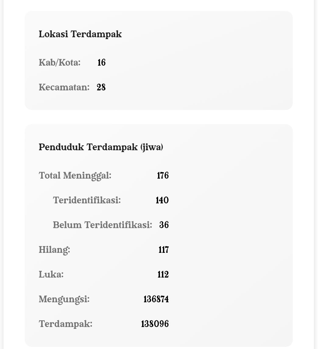 Hingga malam ini, total korban meninggal dunia mencapai 176 orang, dengan 140 korban telah teridentifikasi dan 36 lainnya belum diketahui identitasnya. Selain itu, 117 orang masih dinyatakan hilang, sementara 112 warga mengalami luka-luka.