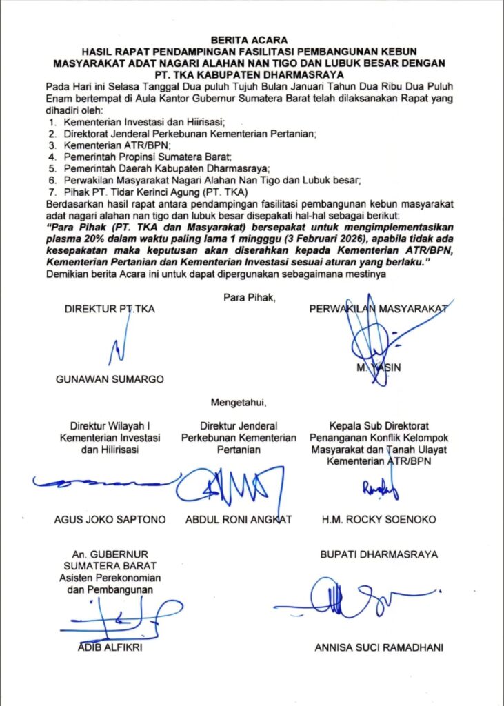 Dalam pertemuan tersebut, para pihak menyepakati implementasi kebun plasma sebesar 20 persen yang harus direalisasikan oleh PT TKA paling lambat dalam waktu satu minggu, yakni hingga 3 Februari 2026. Apabila kesepakatan tersebut tidak terlaksana, maka penyelesaian akan diserahkan sepenuhnya kepada Kementerian ATR/BPN, Kementerian Pertanian, serta Kementerian Investasi dan Hilirisasi sesuai ketentuan peraturan perundang-undangan yang berlaku.