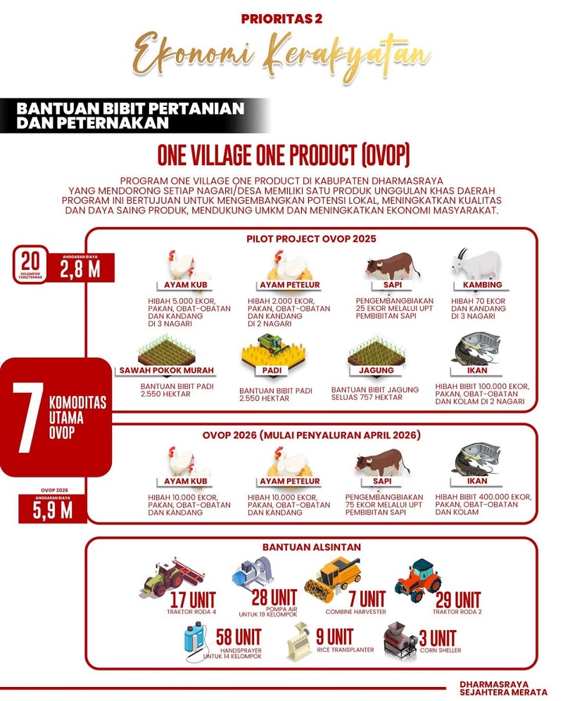 Memasuki 2026, anggaran OVOP meningkat menjadi Rp5,9 miliar dengan perluasan bantuan, di antaranya 10.000 ekor Ayam KUB, 10.000 ekor ayam petelur, pengembangbiakan 75 ekor sapi, serta 400.000 ekor bibit ikan lengkap dengan pakan, obat-obatan, dan sarana pendukung.