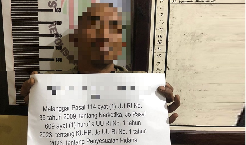 Atas perbuatannya, tersangka dijerat dengan Pasal 114 ayat (1) UU RI No 35 Tahun 2009 tentang Narkotika jo Pasal 609 ayat (1) huruf a UU No 1 Tahun 2023 tentang KUHP serta UU No 1 Tahun 2026 tentang Penyesuaian Pidana.