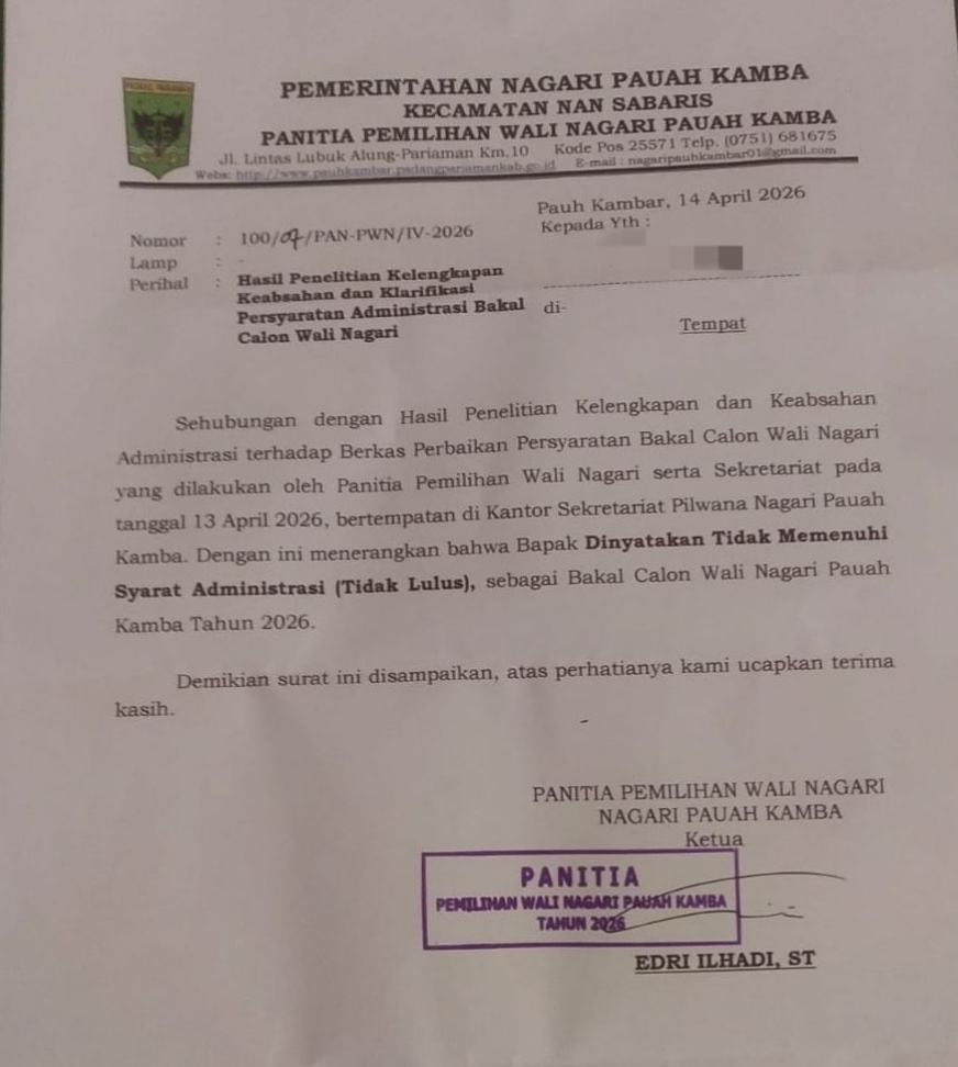 Namun, rekomendasi tersebut tak berbuah hasil. Panitia Pilwana Pauh Kamba melalui Surat Nomor 100/07/PAN-PWN/IV-2026 tertanggal 14 April 2026 akhirnya menyatakan SN tidak memenuhi syarat administratif dan tidak lolos sebagai bakal calon wali nagari.